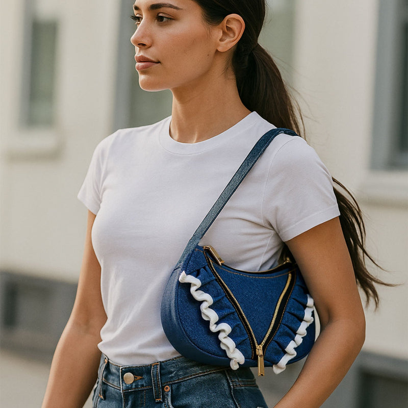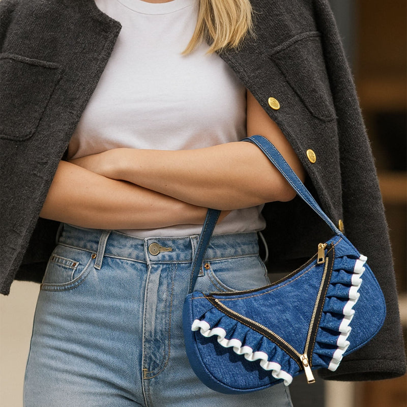 Chic and Recycled Denim Shoulder Bag with Unique Ruffled Design