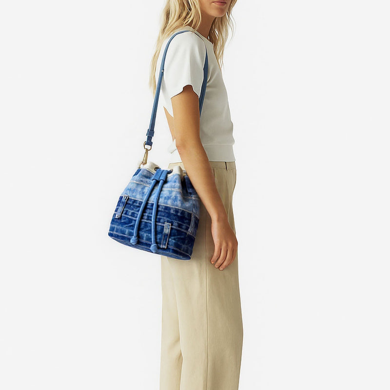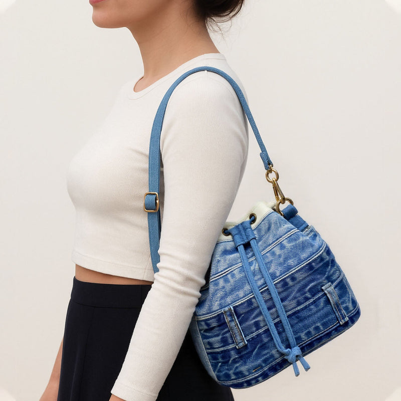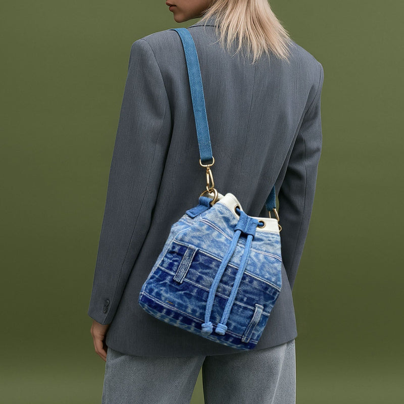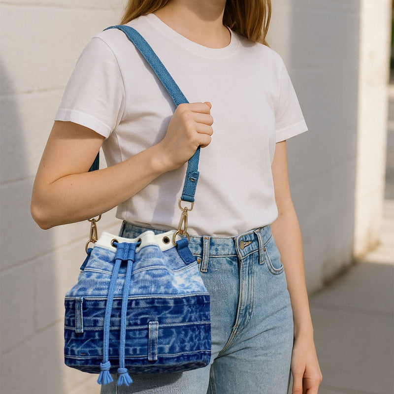 The Eco-Friendly Recycled Denim Bucket Bag is where sustainability meets timeless style. Crafted from upcycled jeans, this bag boasts a distinctive, textured finish that tells a story of responsible fashion and unique artistry. Each bag carries a character all its own, reflecting the beauty of recycling and the elegance of thoughtful design.