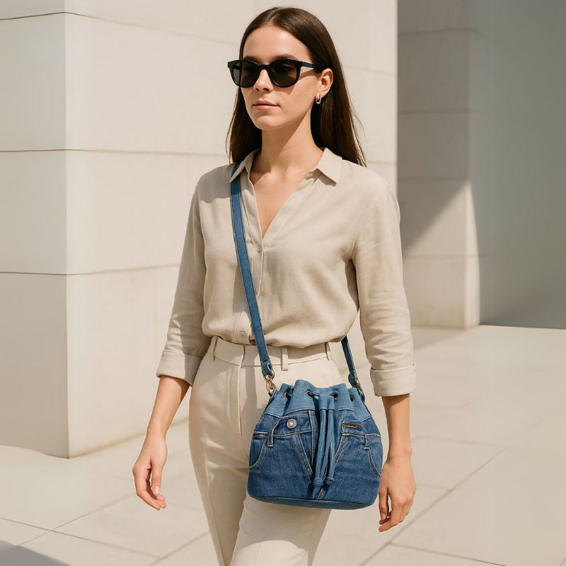Our Handcrafted Sustainable Recycled Denim Bucket Bag brings a touch of artisanal craftsmanship and eco-conscious style to your everyday routine. Made from recycled jeans, this bag blends sustainability and sophistication, offering a unique texture and pattern that makes every piece truly one-of-a-kind.
