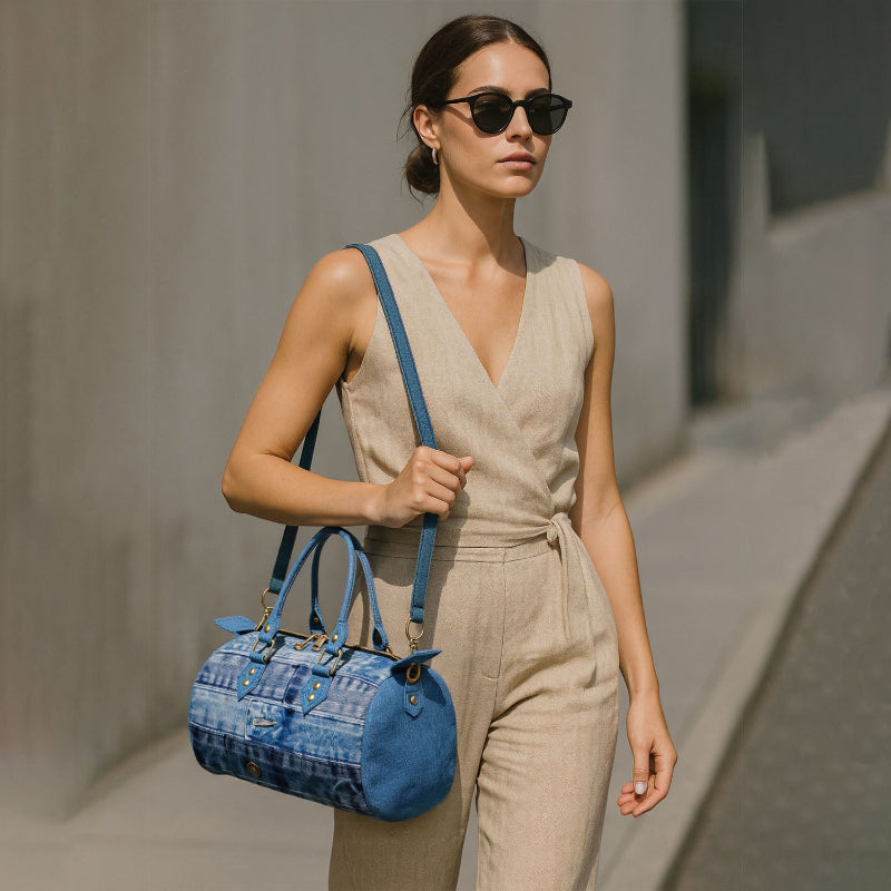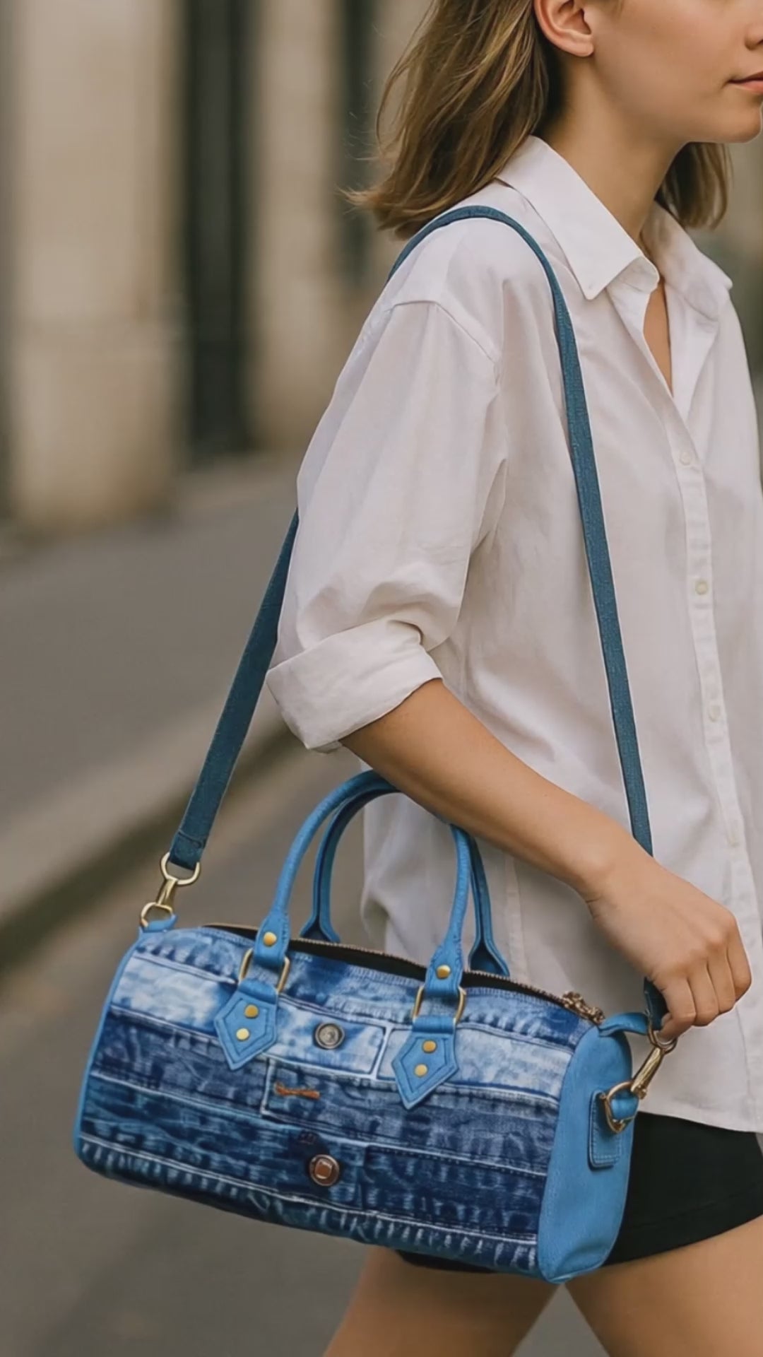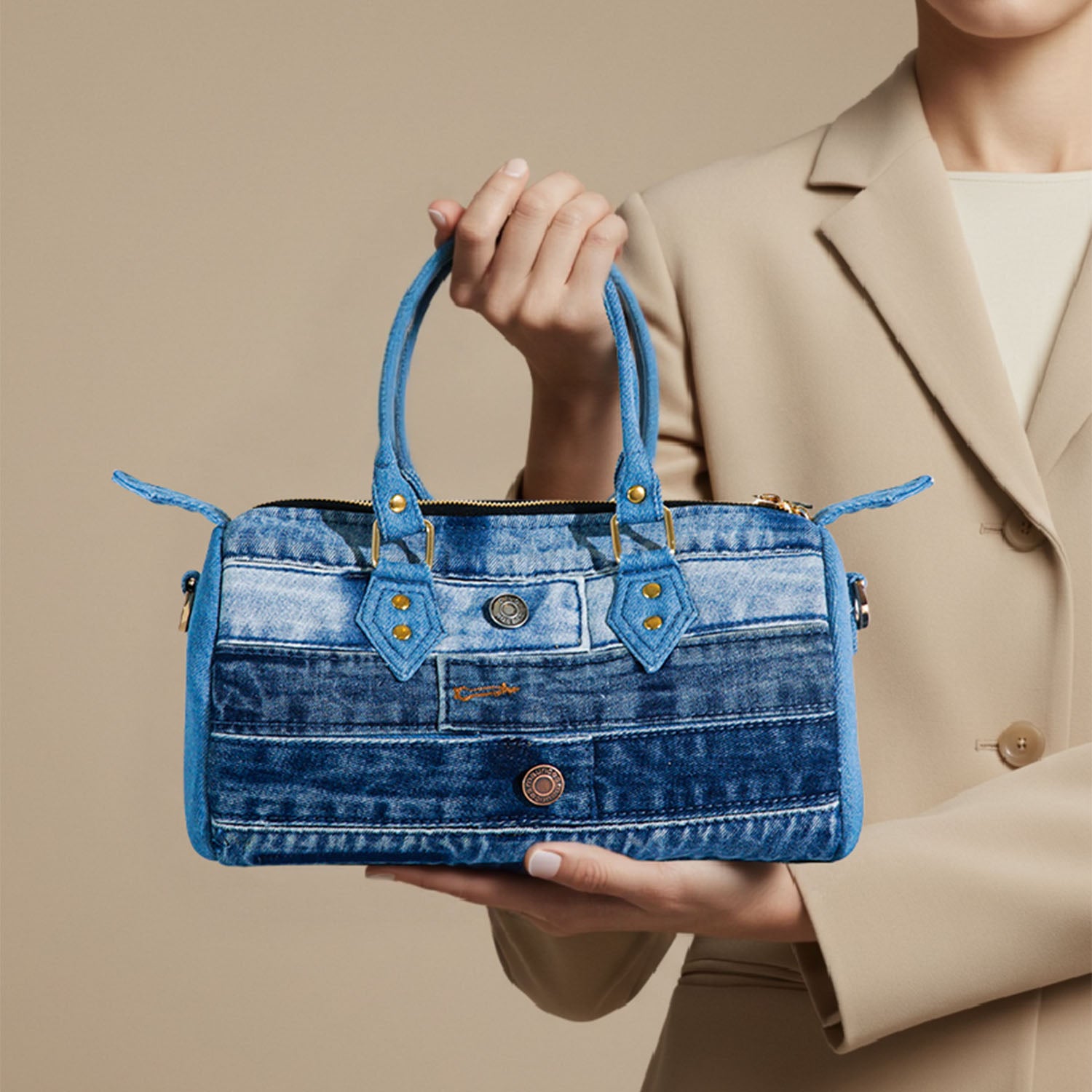 Recycle Unique Denim Barrel Chic Patchwork Handbag