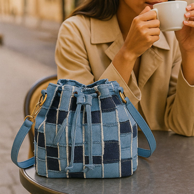 Recycled Denim Bucket Bag with Caro Pattern, Recycled Jeans Bag